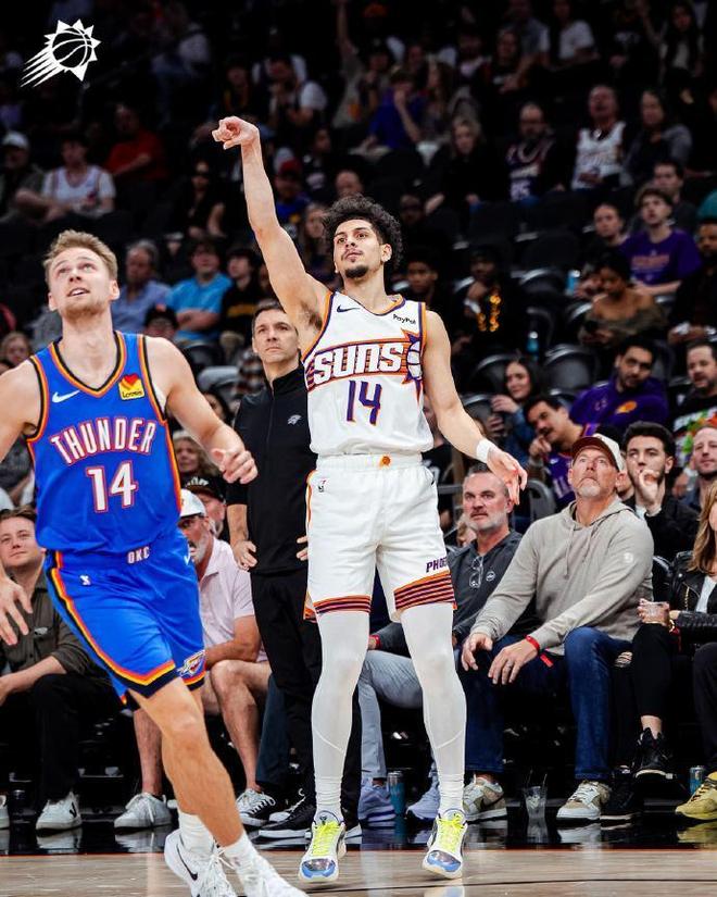 次節比賽,雷霆連續兩節單節35+保持旺盛的進攻火力,且限制太陽連續兩節單節不足30分。雷霆持續碾壓太陽,尤其是喬單節5中4得到15分迎來爆發,前兩節雷霆42中27超過6成準星,其中三分18中11也超過6成準星,雷霆單節38-27凈勝11分,上半場結束雷霆擴大75-52領先太陽23分優勢。前兩節喬15分,但雷霆已經10人得分,太陽2人得分上雙,狄龍與奧尼爾均是12分。